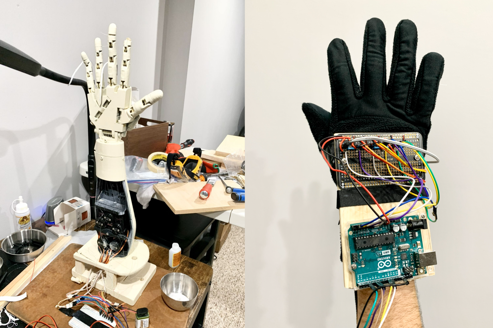 Fully 3D printed animatronic hand that is controlled using force based sensors placed on gloves worn by the users. This animatronic hand is able to imitate and hand movements made by the user.