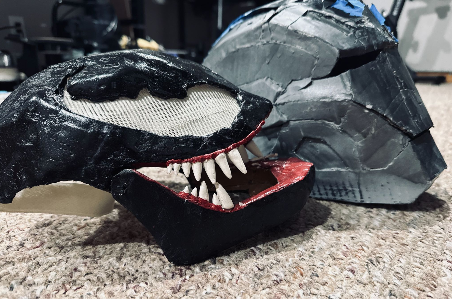 Various custom built cosplay props including a War Machine helmet and Marvel Venom mask.